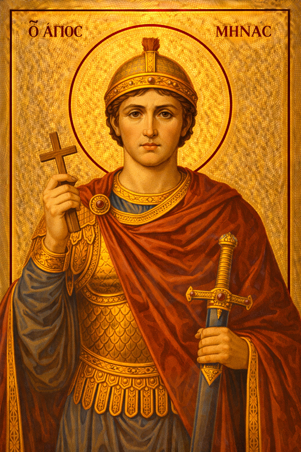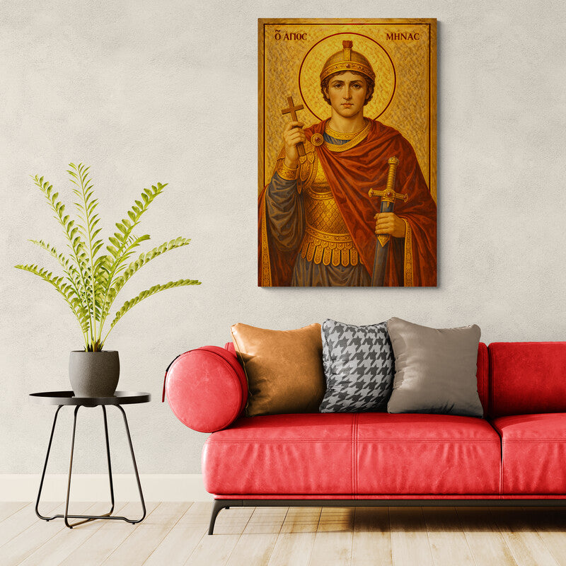 Icoană pe pânză cu Sfântul Mina, pentru decor și devoțiune acasă sau la birou.